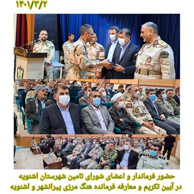 در این آیین ترابی فرماندار و اعضای شورای تامین شهرستان اشنویه با اهدای لوح از اقدامات و خدمات ارزشمند صادق رستم زاده فرمانده قبلی هنگ مرزی پیرانشهر و اشنویه قدردانی کردند.