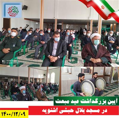آیین بزرگداشت عید مبعث پیامبر اسلام حضرت محمد مصطفی صلی الله علیه و آله و سلم با حضور فرماندار، ائمه جمعه و جماعات، شورای تامین و اداری با اجرای اشعار و برنامه های عرفانی و دف زنی