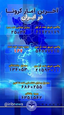 🔴 شناسایی 25034 بیمار جدید کووید19 و فوت 167 هموطن دیگر در شبانه روز گذشته