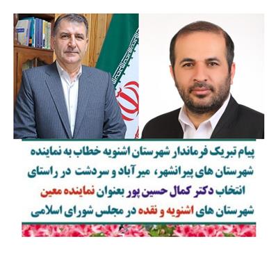 🔹پیام تبریک سید علی ترابی فرماندار شهرستان اشنویه به نماینده محترم مردم شریف شهرستان های پیرانشهر، سردشت و میرآباد در راستای انتخاب دکتر کمال حسین پور بعنوان نماینده معین مردم نجیب و فهیم شهرستان های اشنویه و نقده در مجلس شورای اسلامی
